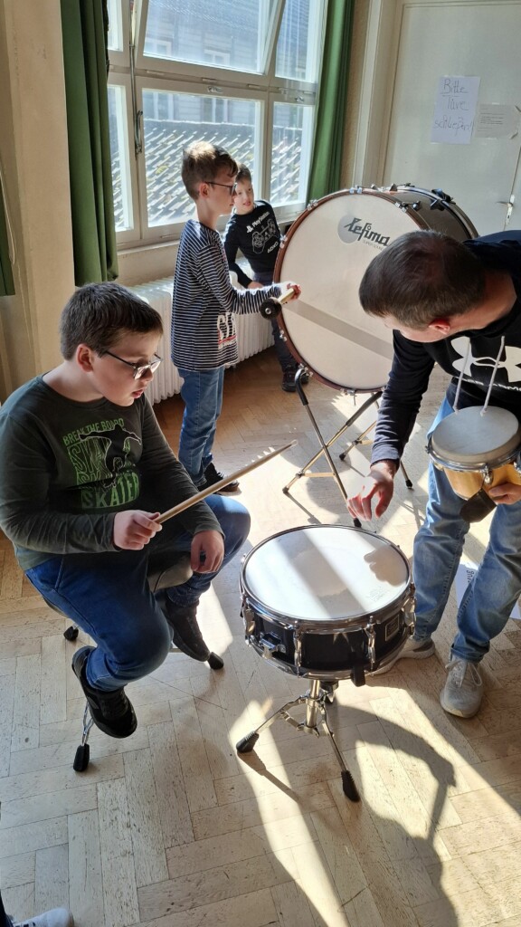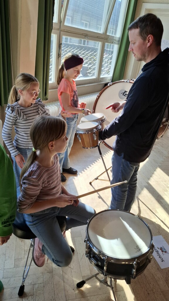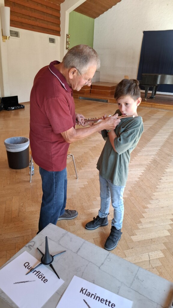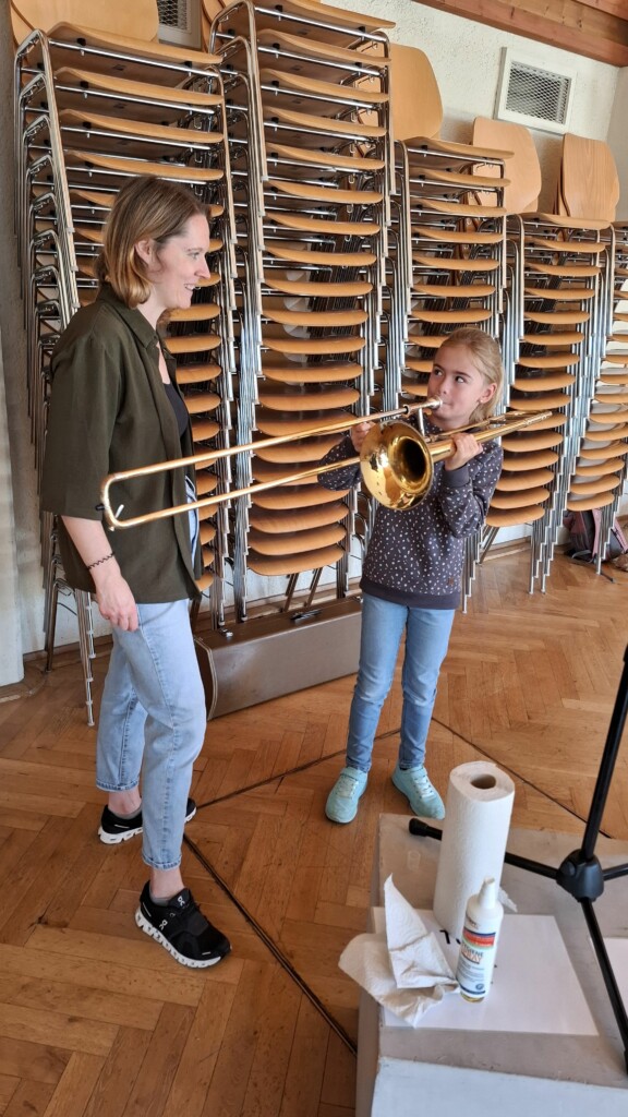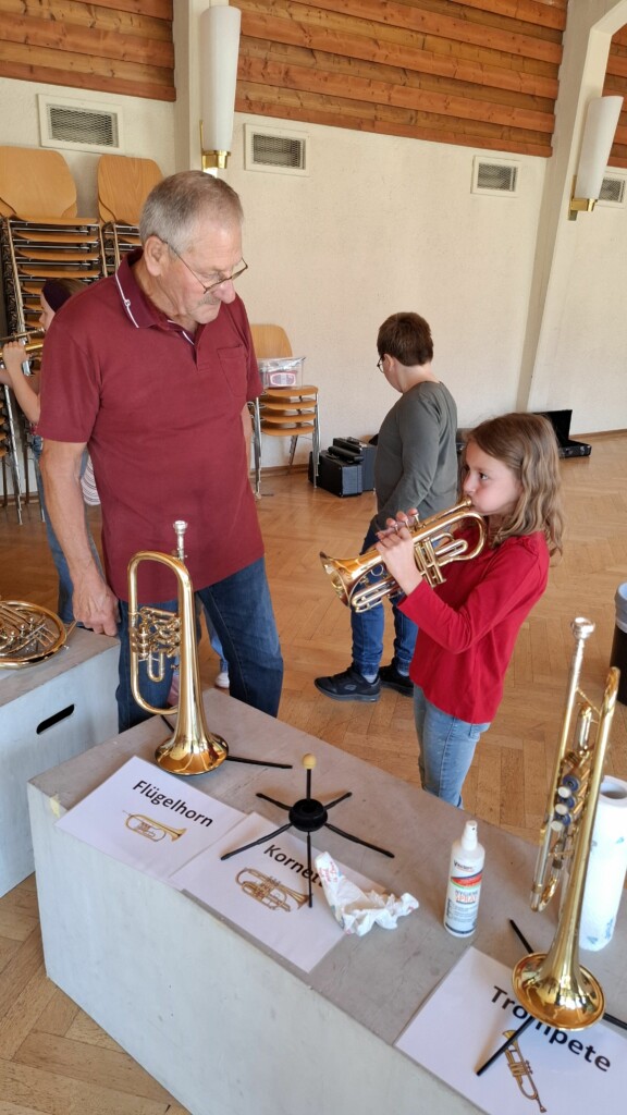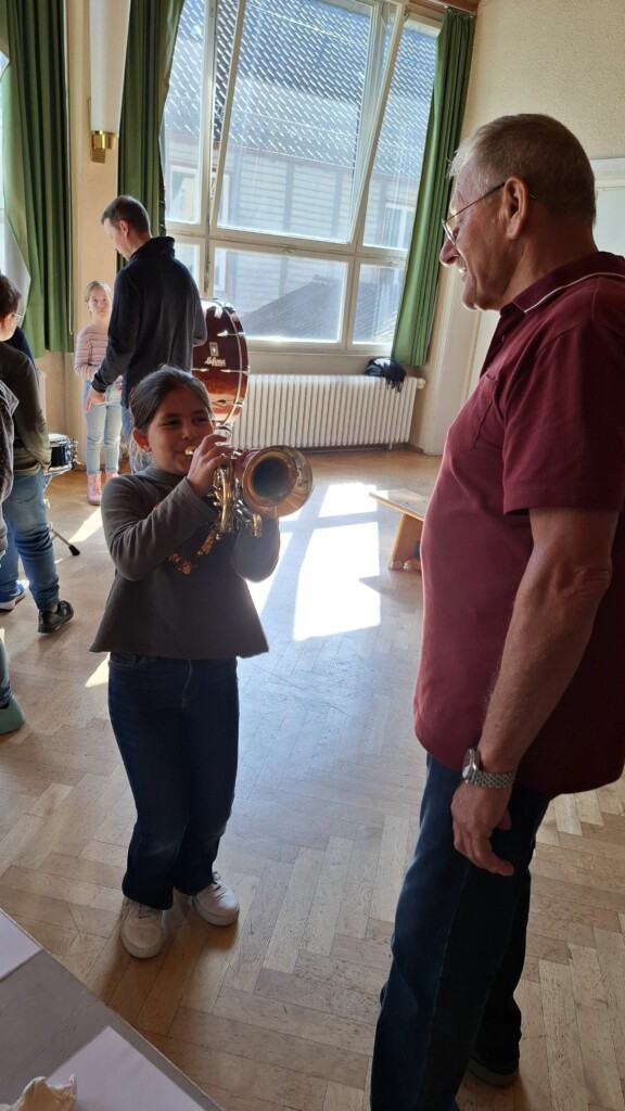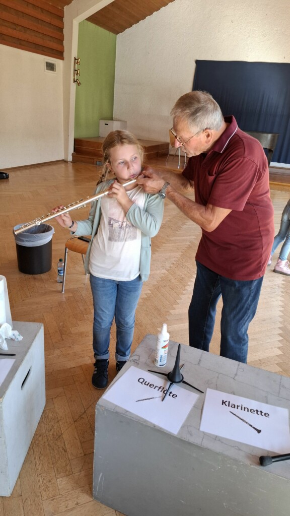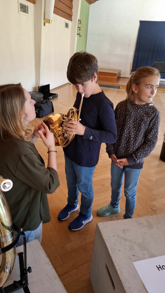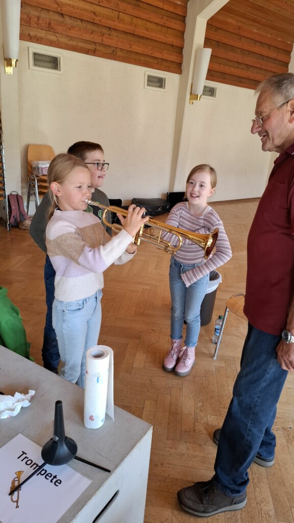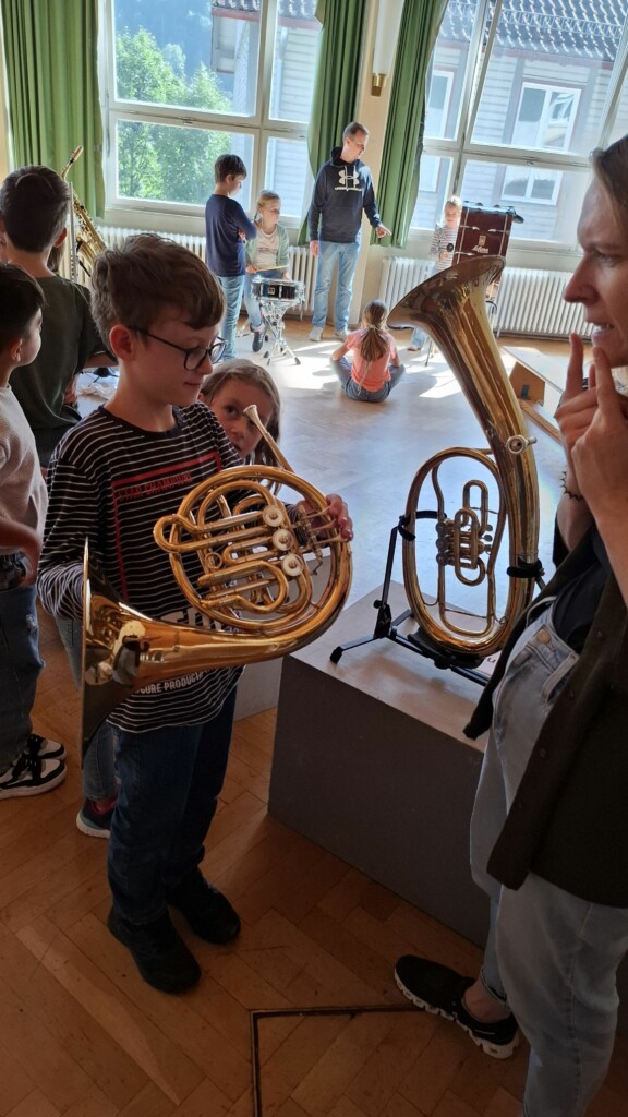 Wie jedes Jahr besuchten am 20.09.24 Musiker des Musikvereins Unterhausen die Drittklässler der Uhland- und Brögerschule. Christoph und Franziska Bubeck sowie Karl-Heinz Lamparter stellten den Kindern jede Menge Blas- und Schlaginstumente vor. Nach einigen Hörproben der Musiker erkannten die Drittklässler, wie sich die Instrumentengröße sowie die Materialbeschaffenheit auf deren Klang auswirkt. Sie benannten rasch einige Beobachtungen: „Große Instrumente klingen tiefer. Das Saxophon gehört dann zu den Holzblasinstrumenten, weil ein Teil des Mundstücks aus Holz besteht!“ Viel Zeit bekamen die Kinder anschließend, die mit viel Freude und Ehrgeiz alle Instrumente selbst ausprobieren durften. Hilfreiche Tipps gaben ihnen dabei die drei erfahrenen Musiker. Tenorhorn, Horn, Trompete, Posaune, Kornett und die Querflöte waren bei den Kindern gleichermaßen beliebt wie die Schlaginstrumente: große Trommel, Snaredrum und Bongos.